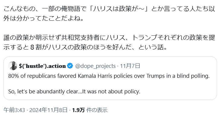 | … | 98626/03/17(火)18:31:10No.1411659240そうだねx1>これに負けたハリスどれだけ人気無かったんだ |
