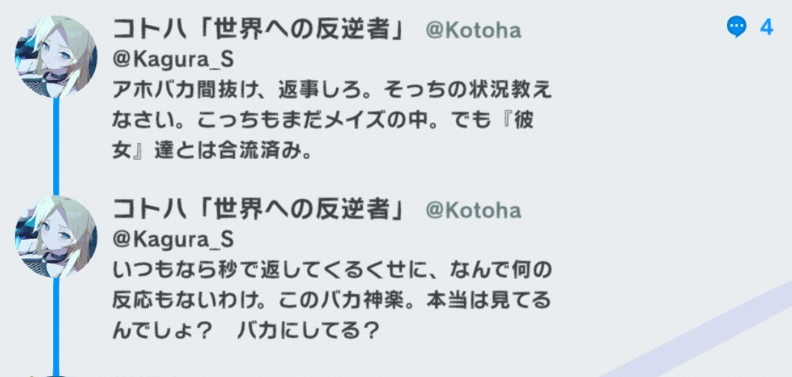 | … | 6926/03/17(火)18:51:33 ID:xcy4N8HcNo.1411665336+とりあえずメインが一応の決着を見るまでバカイベとかできそうにない空気ピコね… |