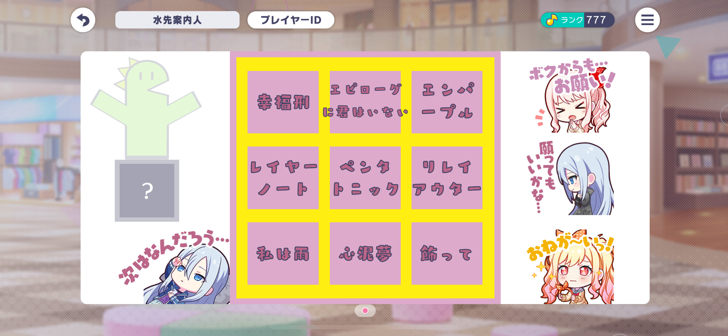 | … | 126/03/17(火)21:00:25No.1411710626+全員おまかせ選曲以外のルールは無いので好きなキャラで気軽に参加してね |