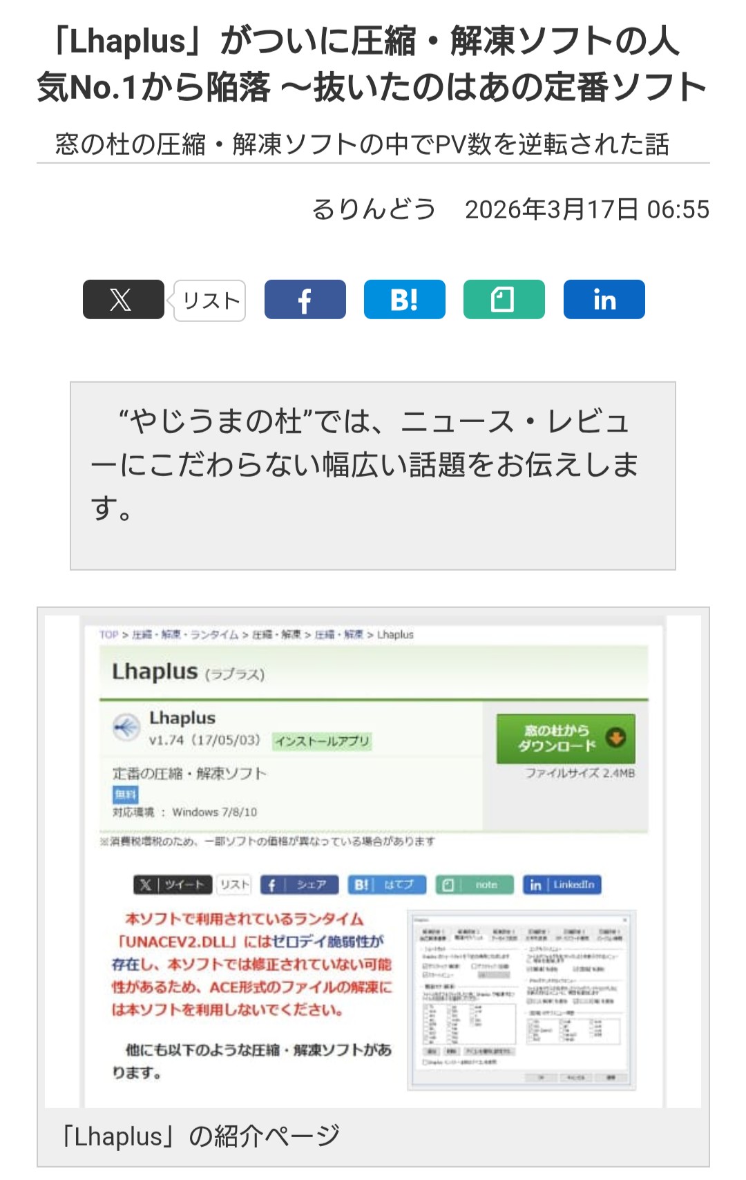 | … | 1726/03/18(水)00:24:27No.1411779596そうだねx12>そんな中、実は窓の杜で、ある試みを行っていました。お気づきの方もいるかもしれませんが、少し前から「Lhaplus」の紹介ページに、より安全な選択肢として「7-Zip」などの誘導リンクを設置していたのです。これが功を奏したのかはわかりませんが、もしかしたら多少なりともPV数に影響があったのかもしれません。 |