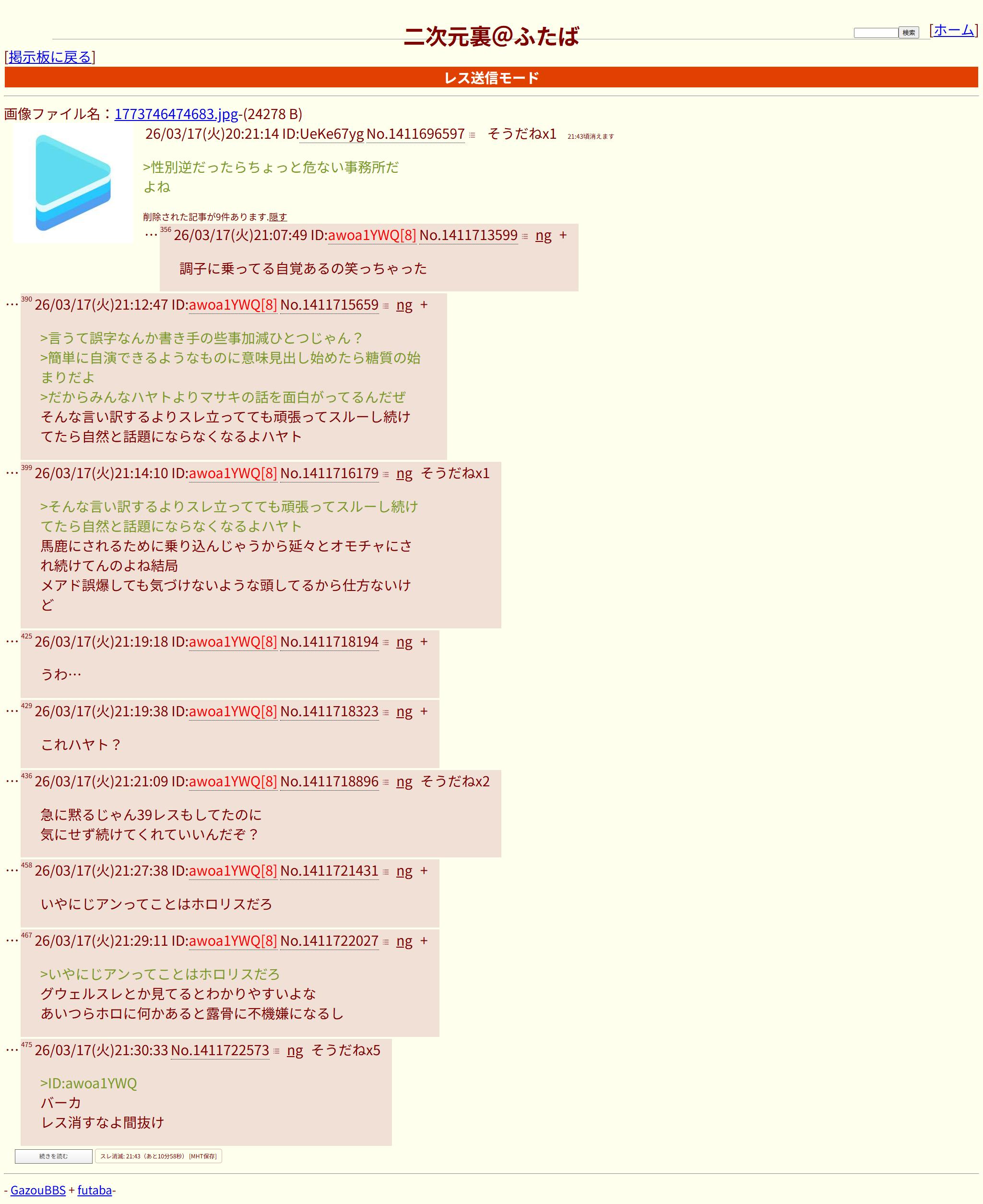 | … | 826/03/18(水)01:40:10No.1411794330+>こいつらは誰かを叩くことが推し活だってほんとなんだな… |