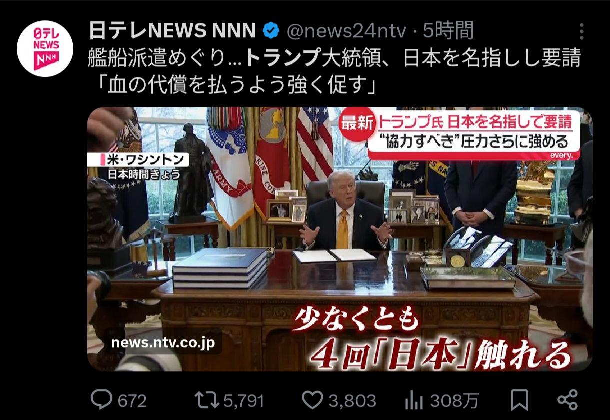 | … | 8226/03/18(水)07:07:02No.1411809377+とりあえず今回に限ってはみんなでアメリカの無茶振りには沈黙しましょうでを貫いてりゃ先に向こうが折れると思う |