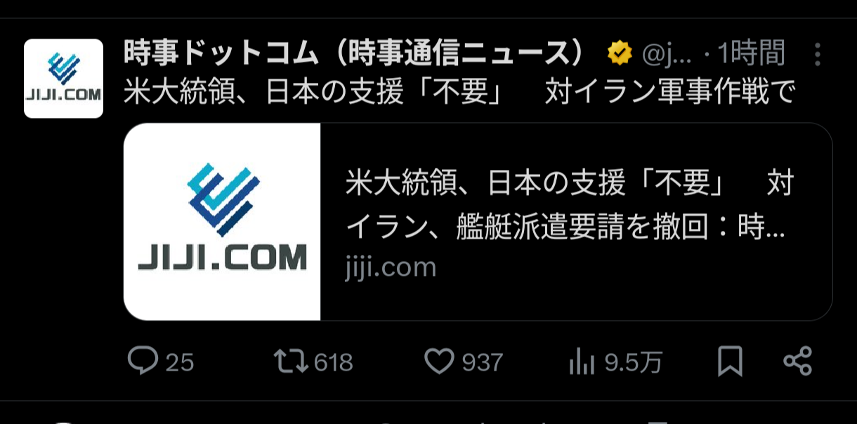 | … | 95026/03/18(水)09:34:21No.1411829470+>>日本は対中対露でアメリカさんの為に睨み利かしてるから中東までは手伝えないよごめんね… |