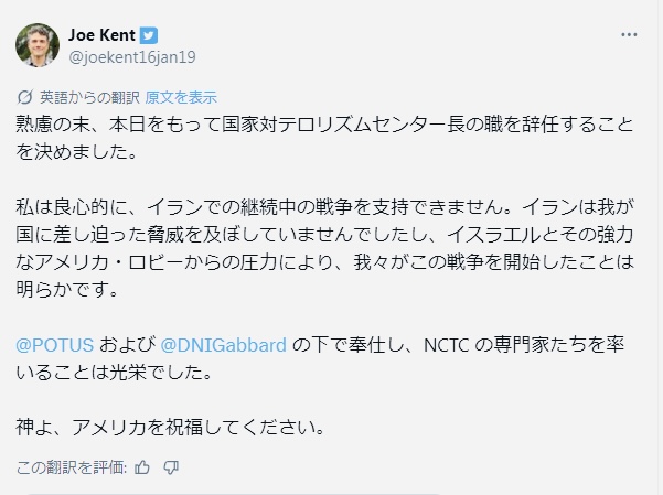 | … | 90526/03/18(水)09:17:02No.1411826596+>>>アメリカの対テロ対策部門のトップが辞任したけど「イスラエルのロビー活動の圧力」とぶちまけてる |