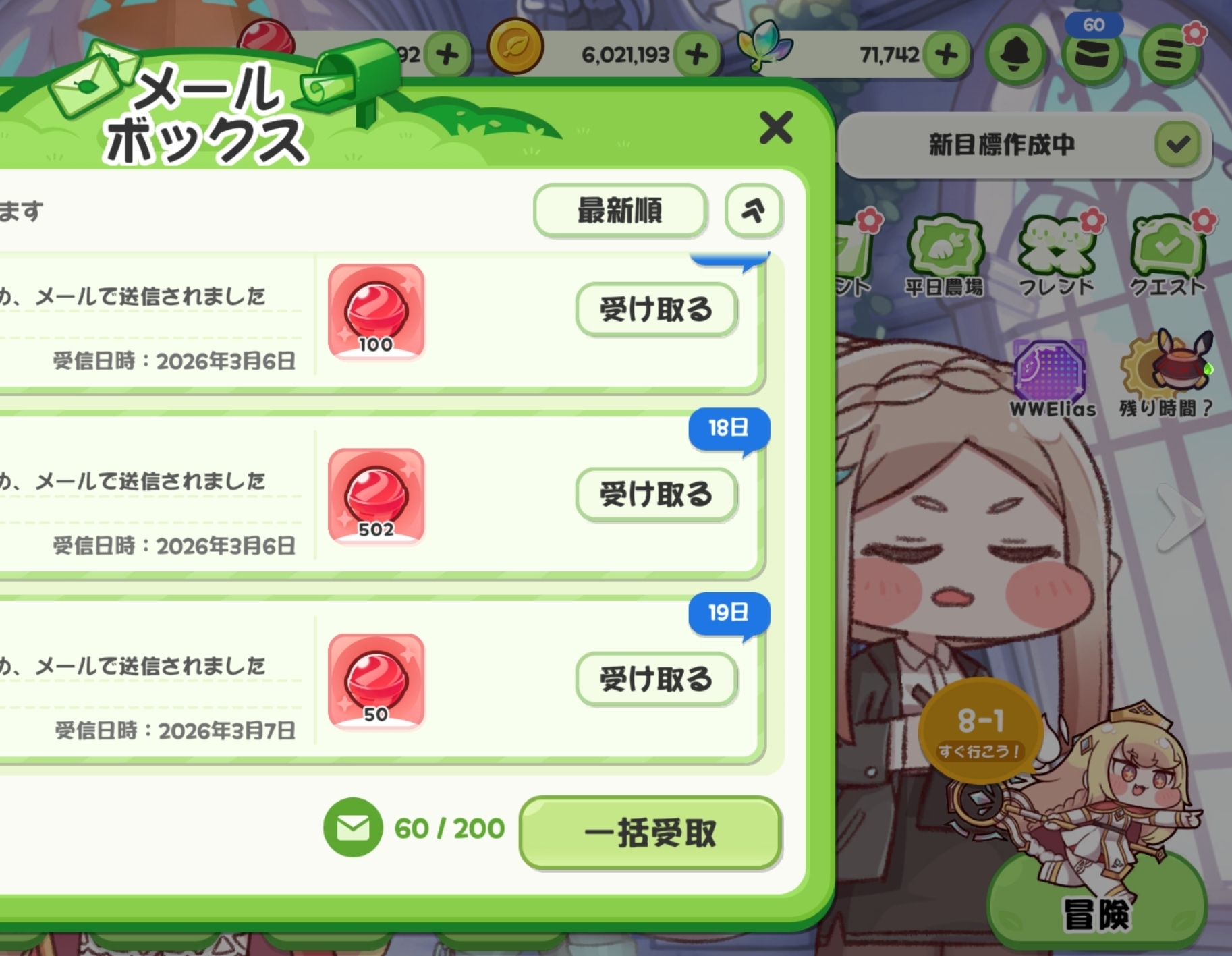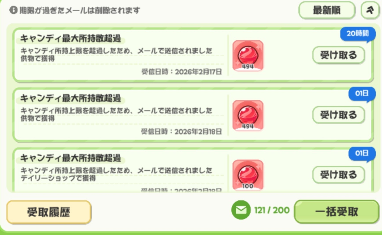 | … | 19626/03/18(水)10:23:16 ID:RvAOMQa6No.1411837646+自然回復キャンディ満タン+ショップ100+定時の50×2+石割りetcでキャンディ増やして それ+供物で1000超えるように供物を受け取ればキャンディ貯め完遂ニャン 時間調整めんどくせぇにゃん |