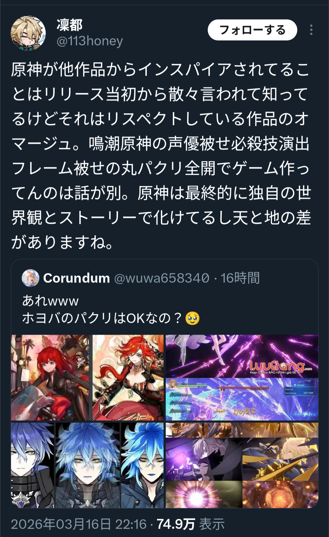 | … | 2126/03/18(水)11:22:39No.1411847521そうだねx8鳴潮の方はよく知らないけどmihoyoはパロディやオマージュはあるけど怒られるタイプのただのパクリもどっちもやってるよ… |