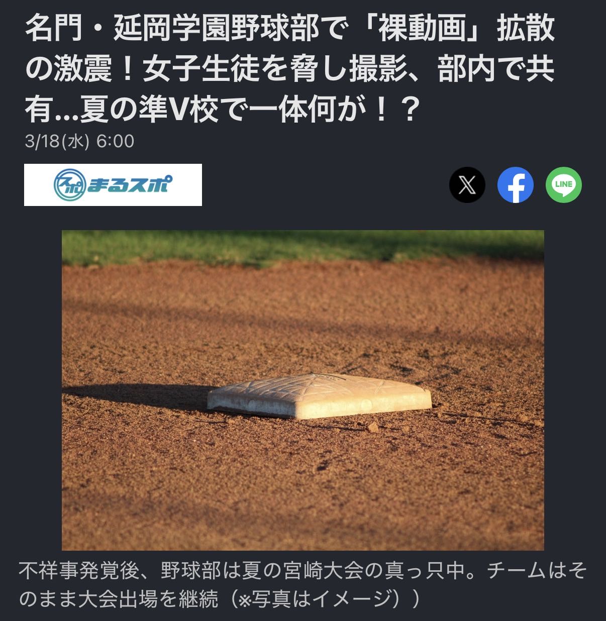 | … | 2326/03/18(水)10:24:55No.1411837871そうだねx48>同校は直後に県警延岡署に相談。野球部は当時、夏の宮崎大会に出場しており、県高校野球連盟にも報告し、口頭で注意を受けた。野球部は大会出場を継続し、準々決勝で敗れた後、活動を1週間自粛した。 |