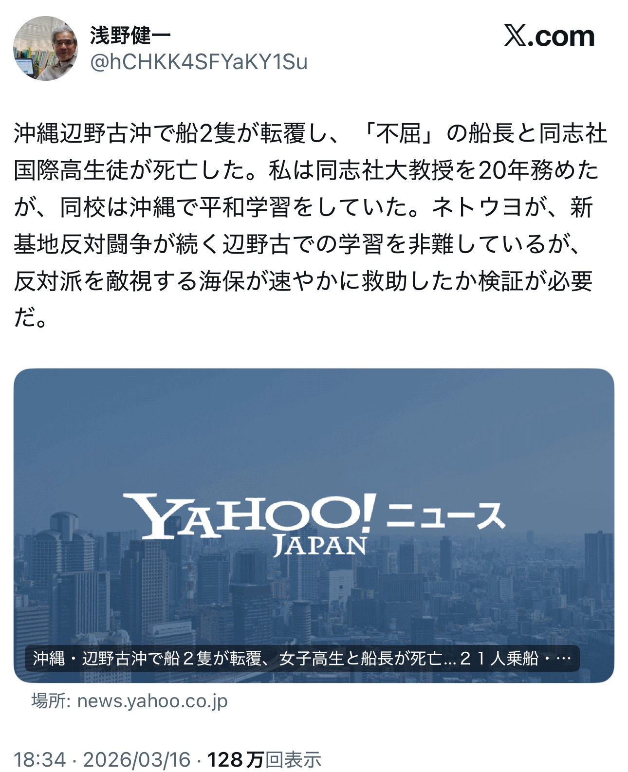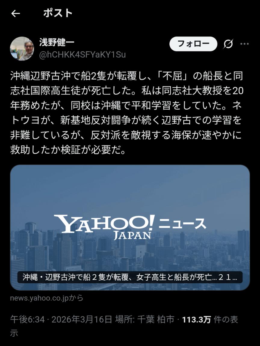 | … | 2626/03/18(水)12:18:43No.1411862342そうだねx13>左翼曰く悪いのはネトウヨと海保らしい |