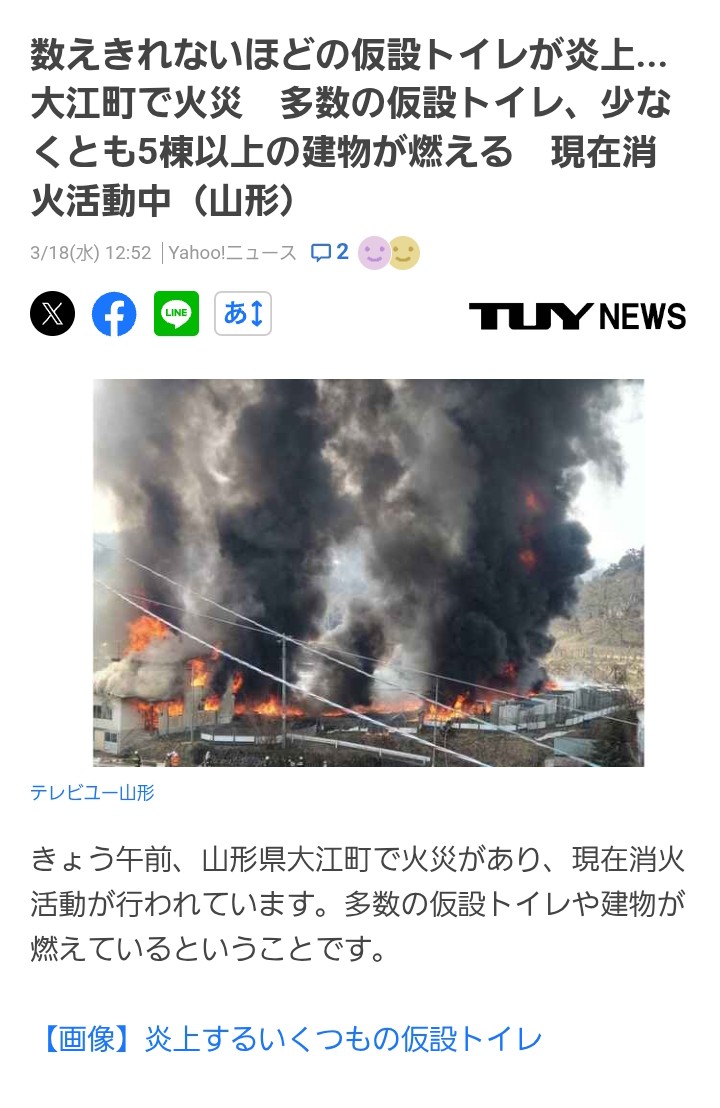 | … | 8026/03/18(水)16:02:31No.1411914202+原油が入ってこなくなるこのタイミングで仮設トイレ大量焼失はかなり問題でしょ |