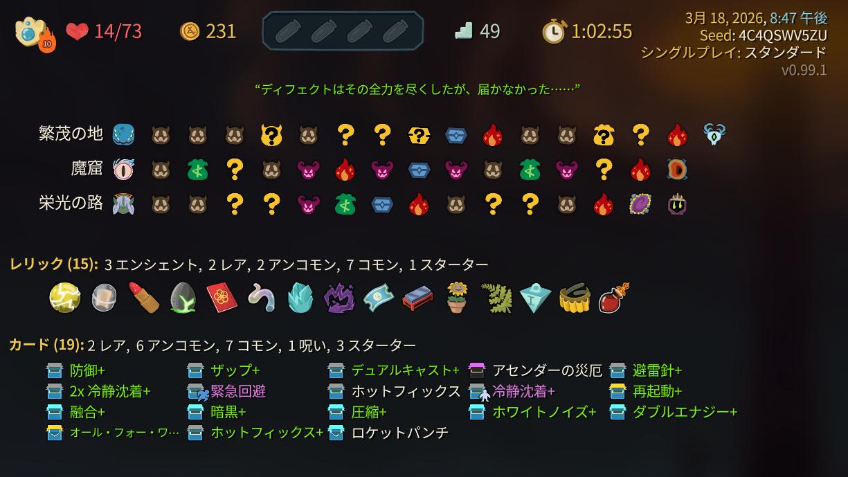 | … | 13526/03/18(水)21:37:13No.1412012359+A10のときはボスで25回復のレリックを店で買っておくんだ |