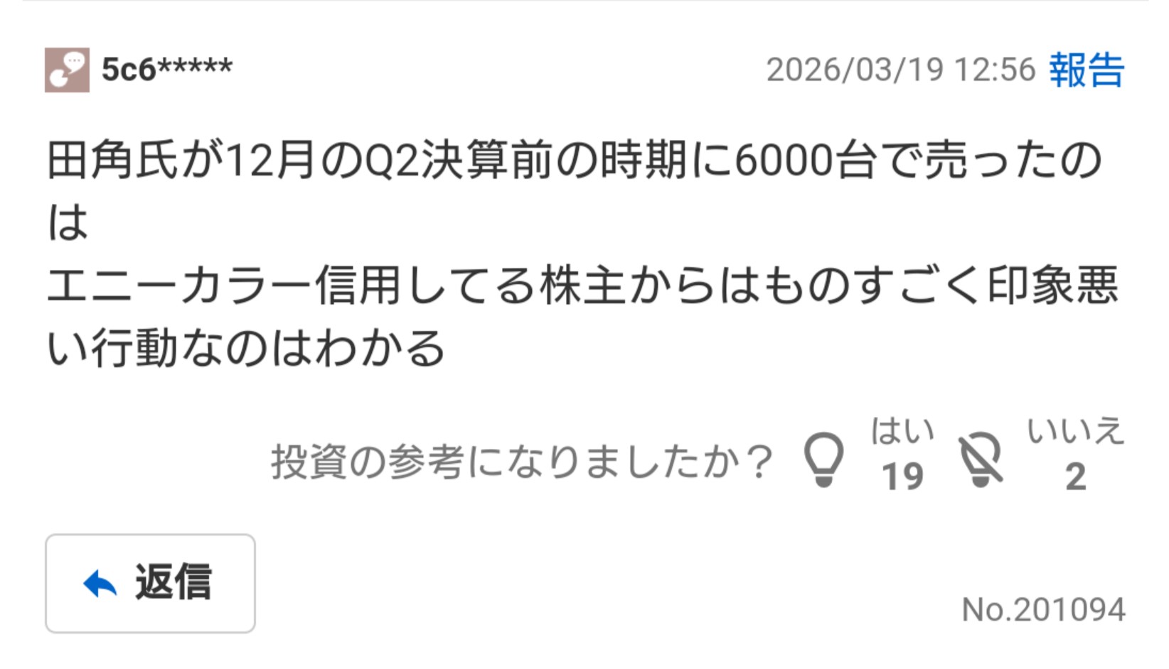 | … | 9626/03/19(木)13:10:14No.1412169578そうだねx1>そういや質疑応答でも何で株売ったかの質問無かったな |
