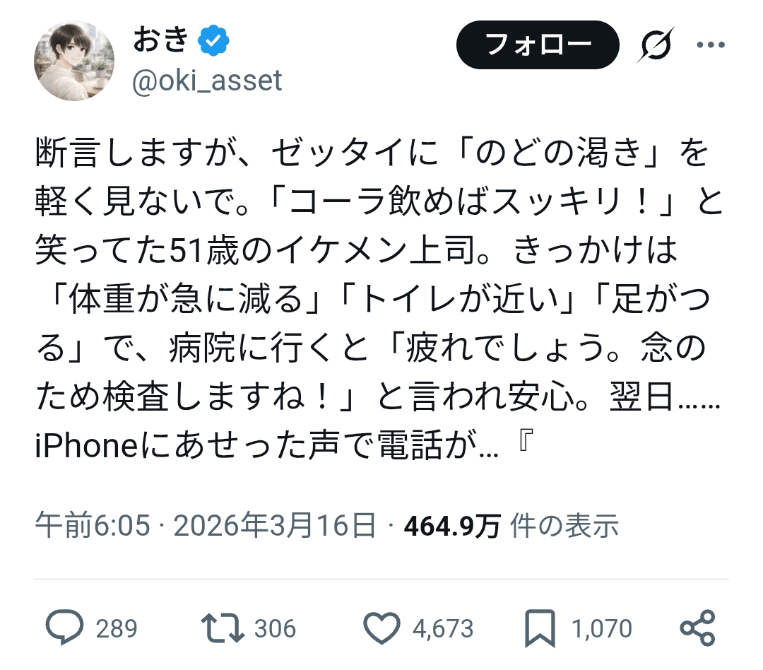 | … | 1026/03/19(木)13:11:55No.1412169921そうだねx12上の症状聞いて糖尿病でしょうじゃなくて疲れでしょうって言う病院大丈夫か? |