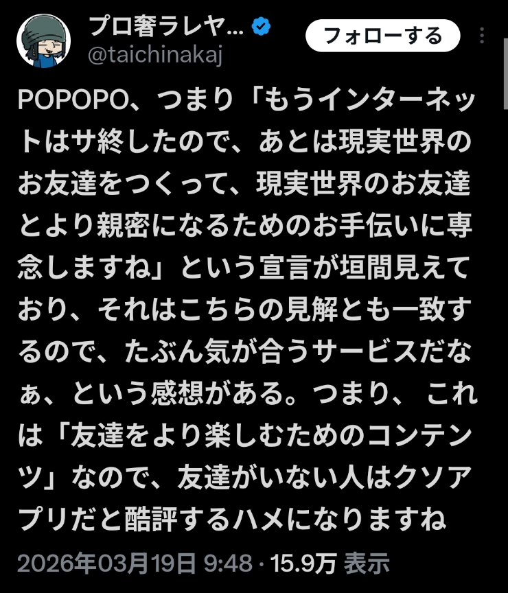 | … | 9726/03/19(木)14:40:44No.1412186583+POPOPOを持ち上げる為にSNSは終わりみたいにいいたいんだろうけど |