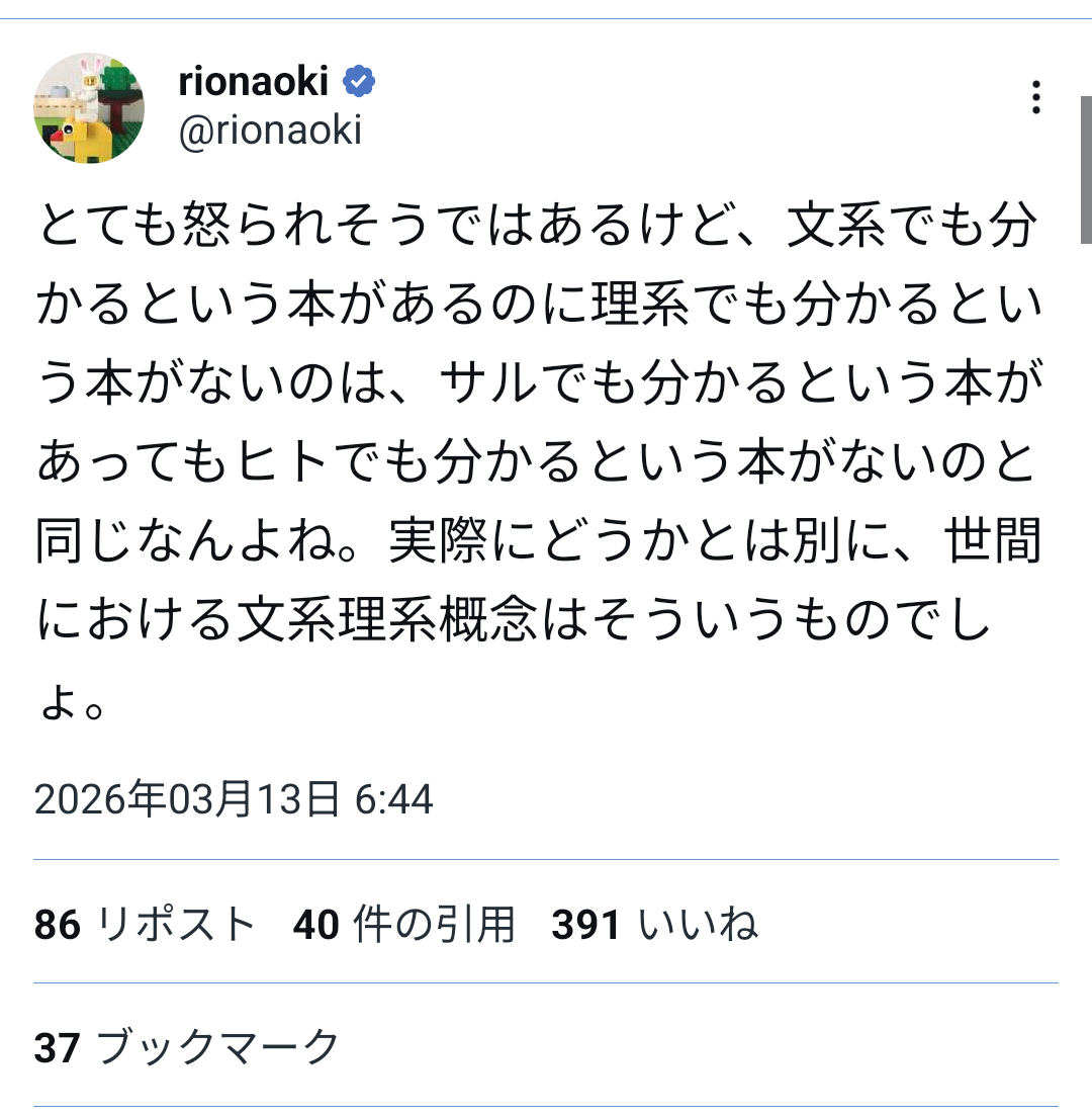 | … | 2126/03/19(木)17:07:08No.1412216073+>シンプルに理系が文系分野を学び直さなきゃいけない場面が少なく需要がないのでは |
