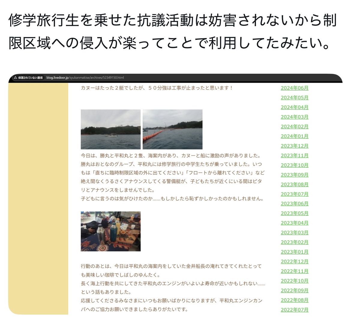 | … | 7026/03/19(木)18:49:39No.1412241569そうだねx8>・学校側は「辺野古移設に反対する人の船」と説明し「活動家の船」と説明していない |