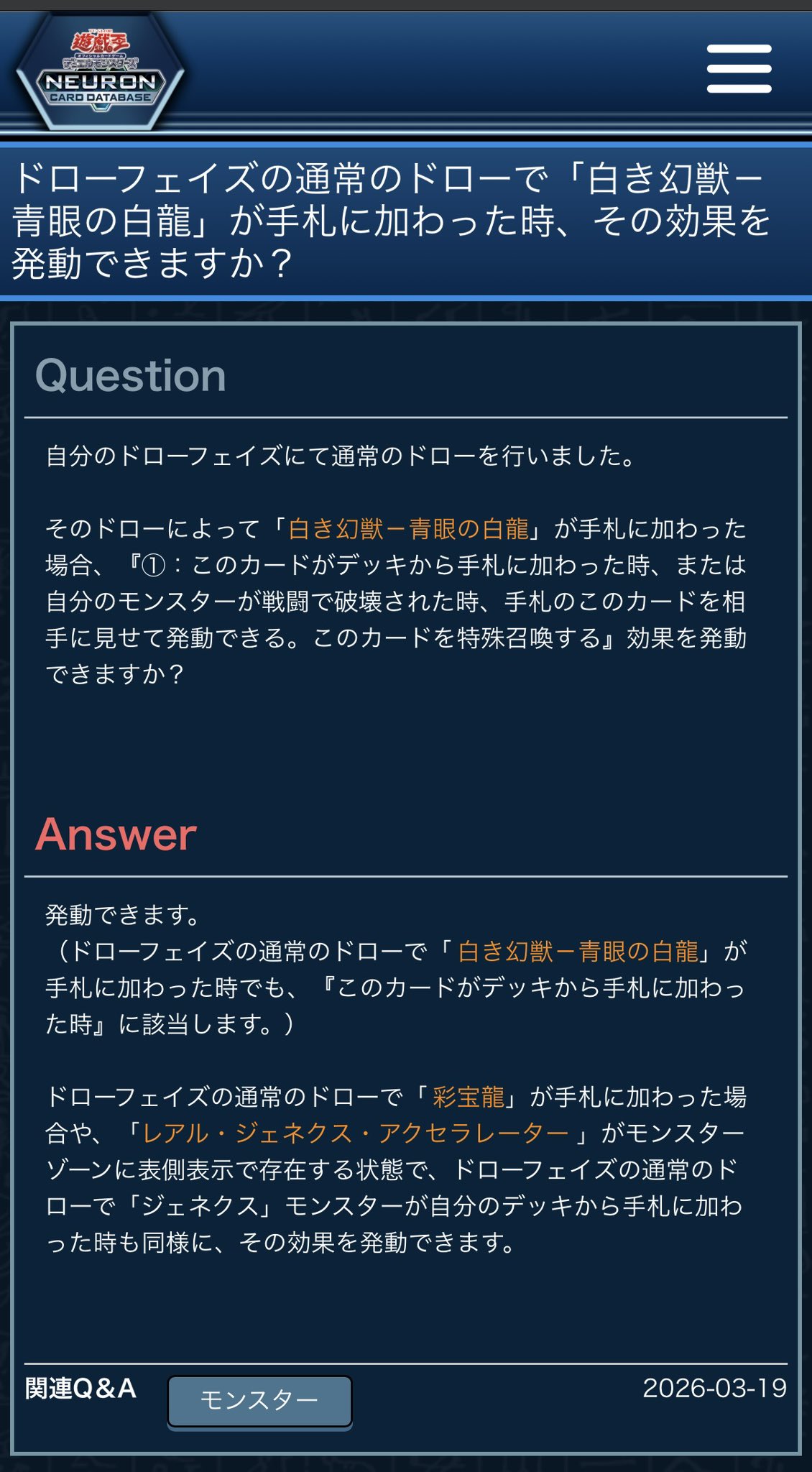 >実務上問題になるのは「時の任意効果なのでGフワロス影響下でチェーン1・チェーン2ともに特殊召喚が発生しチェーン2の方のドローで白き幻獣を引いた場合タイミングを逃すため、効果処理後にどのタイミングでドローした白き幻獣なのかを白き幻獣をプレイする側が証明する必要がある」かなって