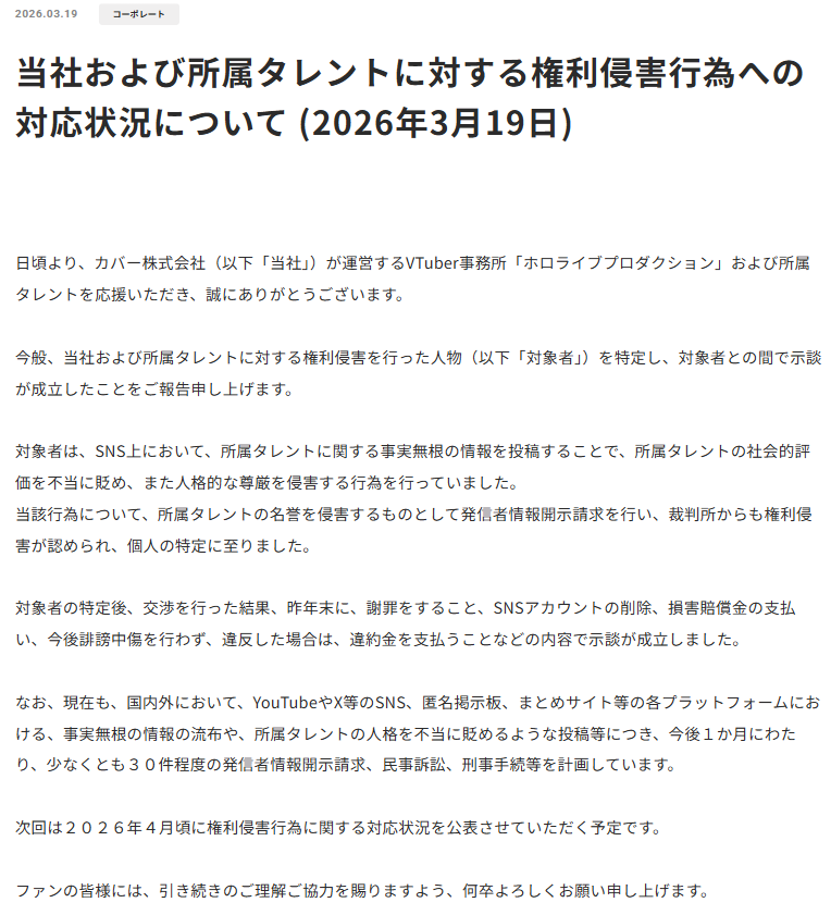 | … | 2726/03/19(木)20:14:43No.1412268178+>img見てたら明らかに最盛期に比べてホロ粘着や誹謗中傷減ってるから少しずつとは言え潰していった意味は充分あるんじゃない? |