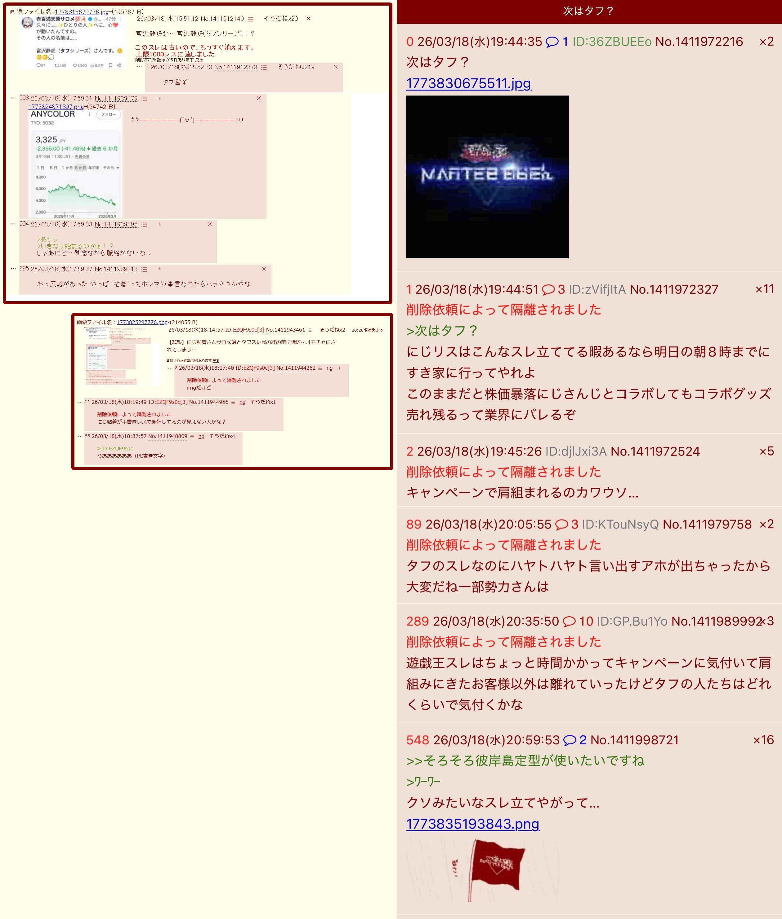 | … | 3826/03/19(木)20:41:15No.1412277712+>>さっき散々にじの不祥事タフ語録に改変されて遊ばれたじゃん |