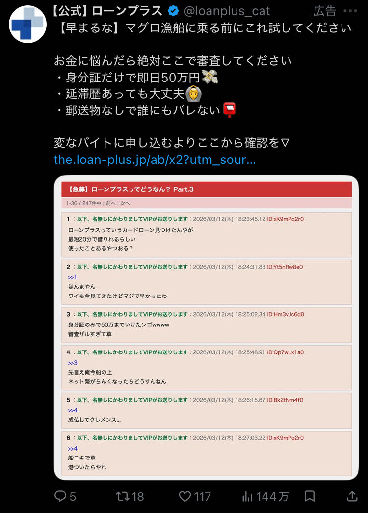 | … | 4826/03/19(木)20:15:17No.1412268396+コミュニティノートで詐欺です付けられてるような広告平気で垂れ流してんじゃねーよカス |