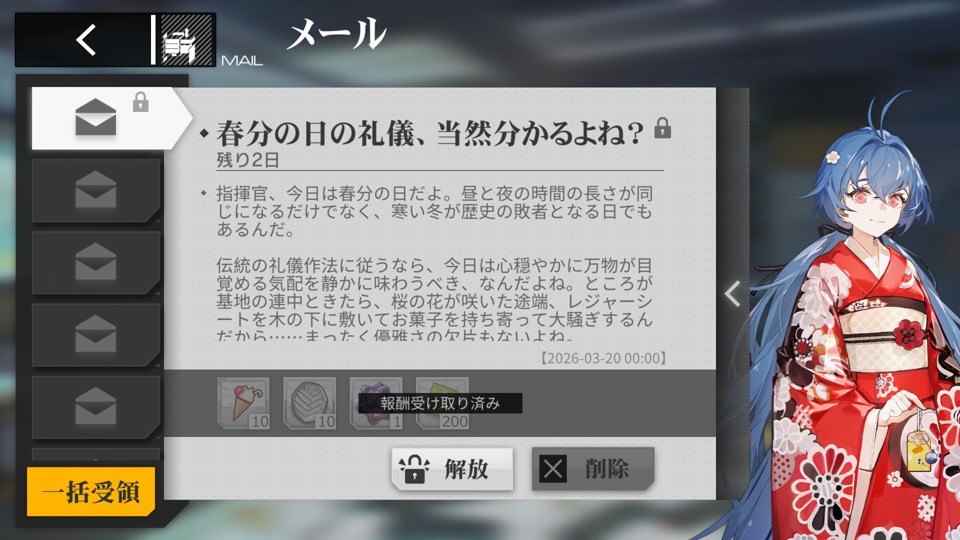 | … | 2926/03/20(金)00:11:47No.1412353640そうだねx31の方にシプカちゃんから春分の日メールが来てたぞ |