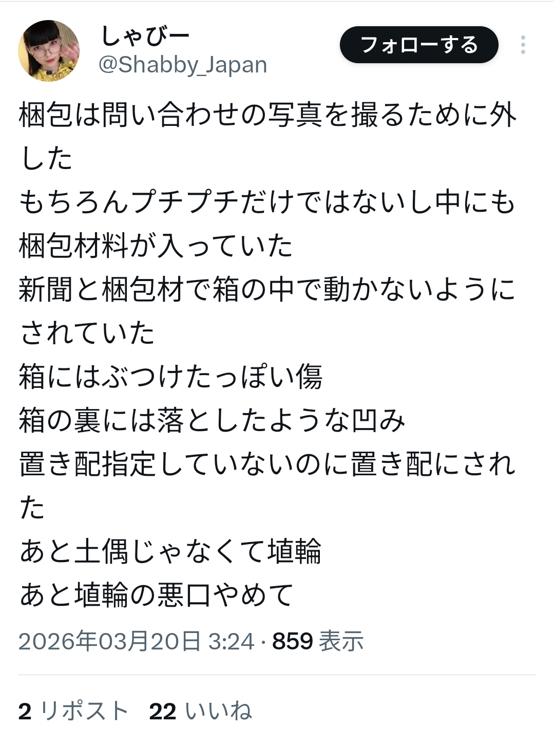 | … | 5126/03/20(金)06:48:37No.1412390338そうだねx4梱包しっかりしてましたって言えば言うほど開封時に自分の不注意で割ったのをヤマトに罪なすりつけてるようにしか見えんのだけど… |