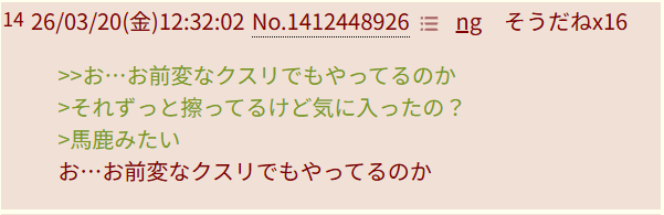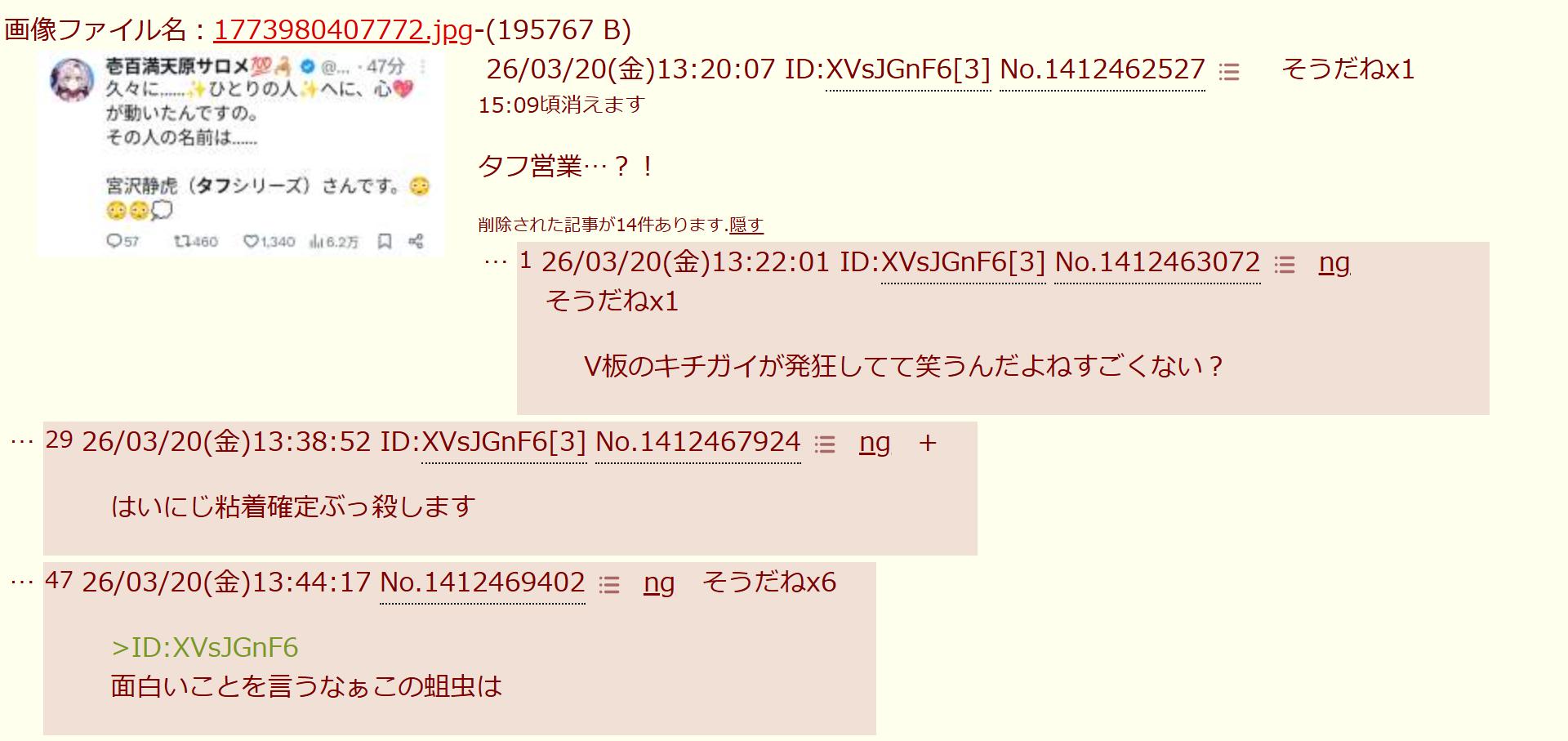 | … | 9026/03/20(金)14:02:16No.1412474071そうだねx5>対立煽りしてるってモロバレの粘着荒らし |