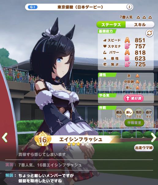 | … | 7326/03/20(金)18:54:52 ID:K.7.bXIANo.1412549250+>まあその時人気が低かったってのは知ってますが >根性マイナスでどんな補正かけたら7番人気にまで落ちるんでしょうかね…? あれライバルに花を持たせって内容ありますからなんか直接人気に補正かける能力あるんでしょう 実際に搭載できたら伏兵とかのスキルとか低人気のときに効果が上がるスキルを運以外で使えるようになって面白そうではあります |