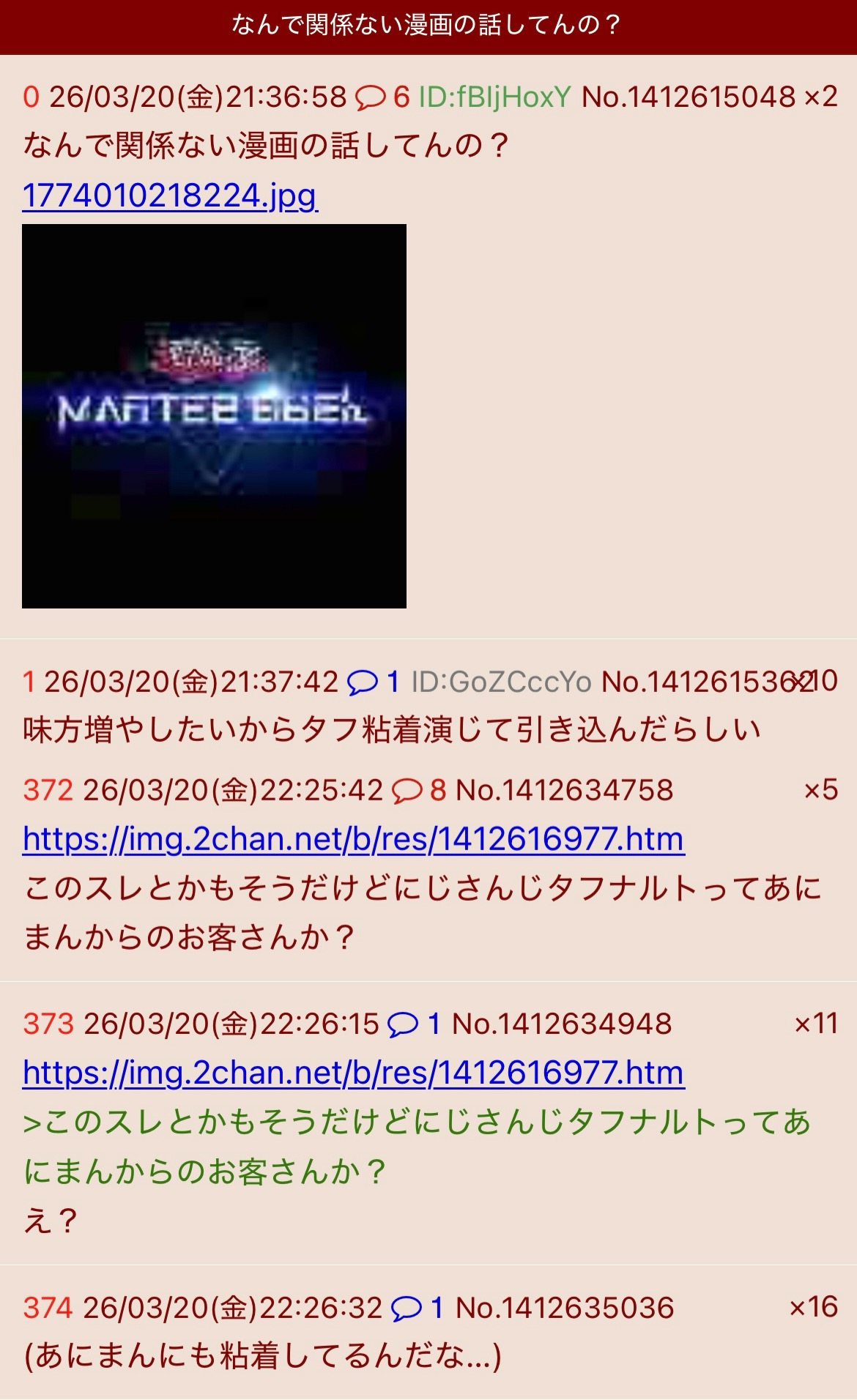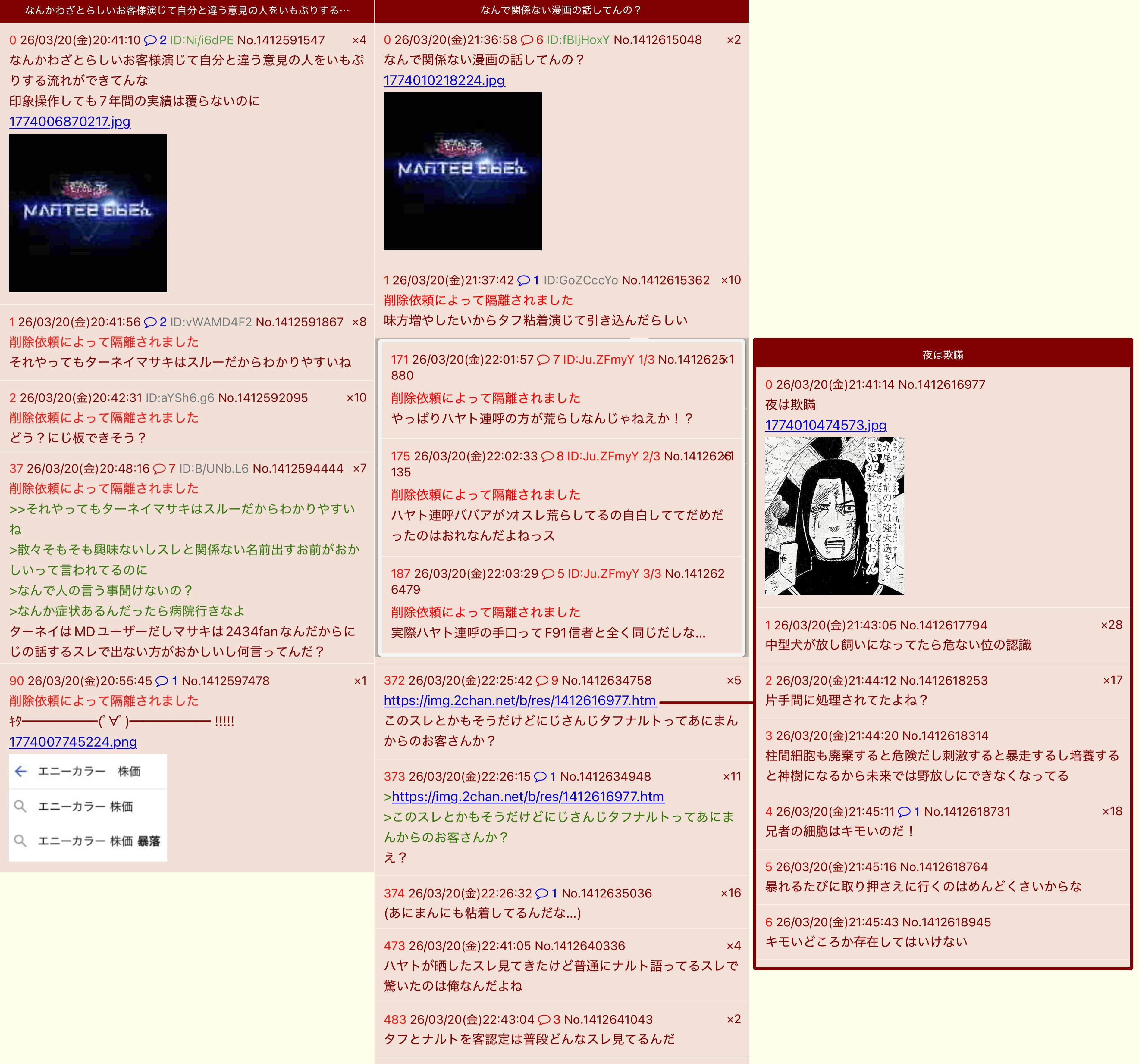 | … | 1126/03/20(金)22:50:25No.1412643582そうだねx1そのあにまんって言い出したレスも普通に扉間語ってるスレを貼って言い出したから意味がわからない |