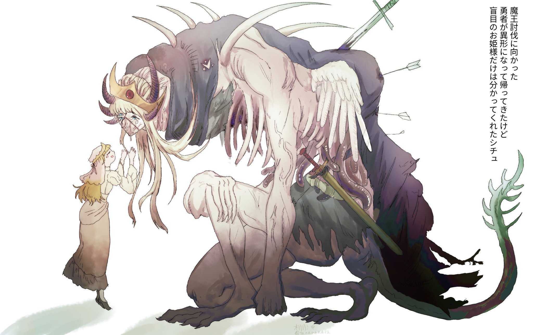 | … | 1426/03/21(土)00:47:00No.1412681003+別に魔王も倒せたわけでもないしめっちゃ剣とか矢刺されてるし可哀想 |