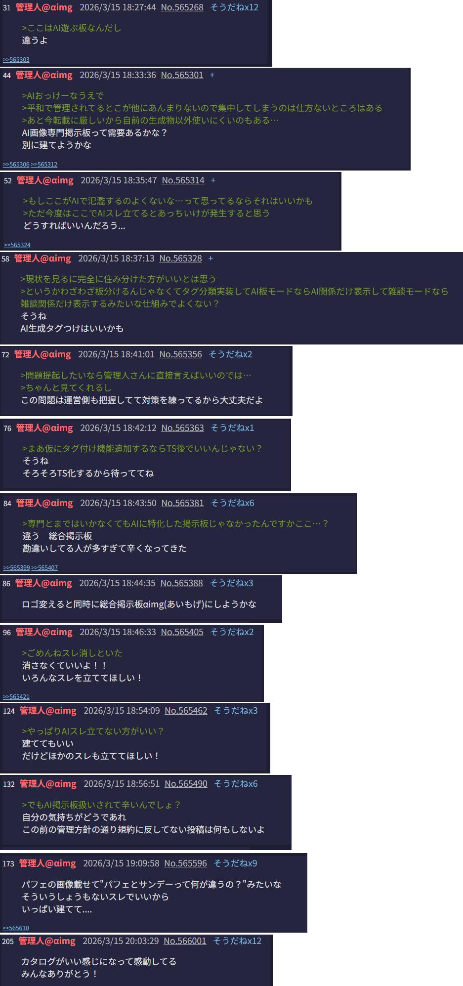 | … | 2926/03/21(土)00:39:48No.1412678912そうだねx5>管理人がAI専門版扱いする奴らに困ってると独白して |