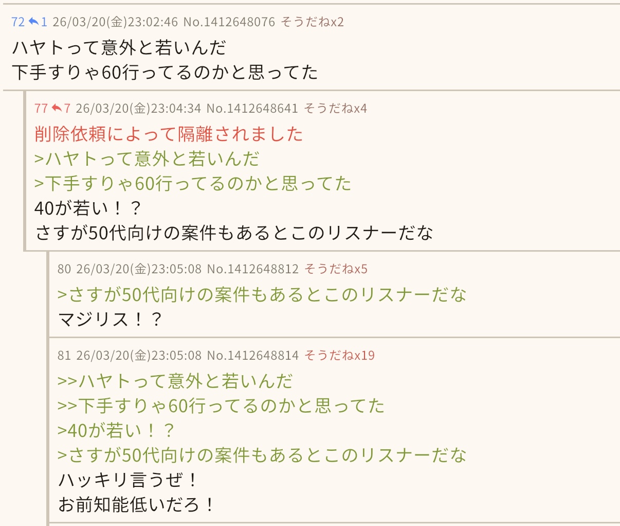 | … | 8026/03/21(土)02:05:50 ID:1kWt47a6No.1412697257+スレッドを立てた人によって削除されました |