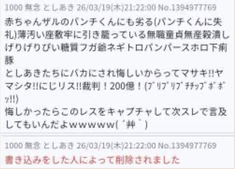 | … | 5426/03/21(土)01:09:22 ID:oU8ydbO2No.1412686882そうだねx3>スレッドを立てた人によって削除されました |