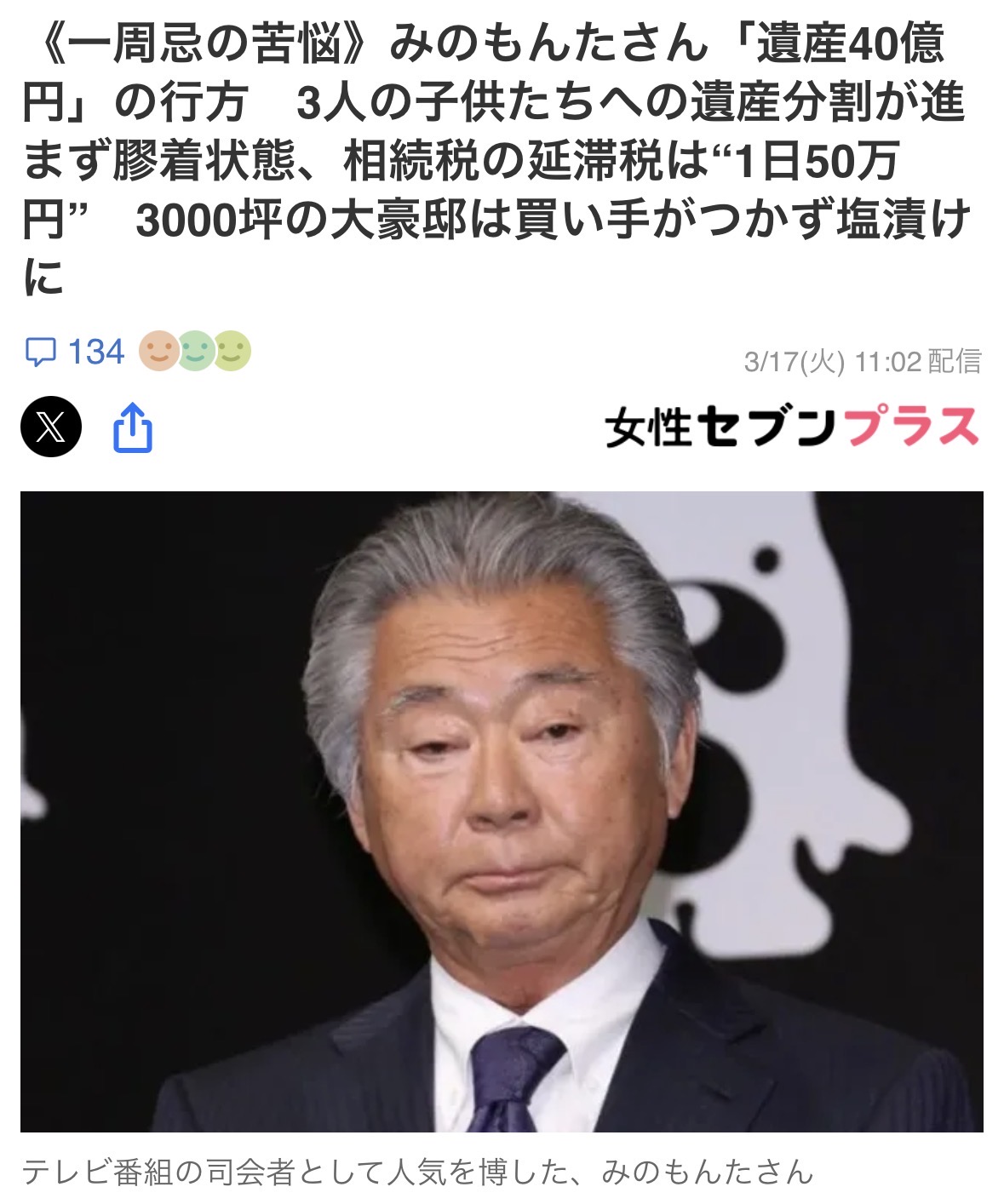 | … | 9226/03/21(土)07:15:37No.1412716080そうだねx15>みのもんたでも40億円しかなかったんだな |