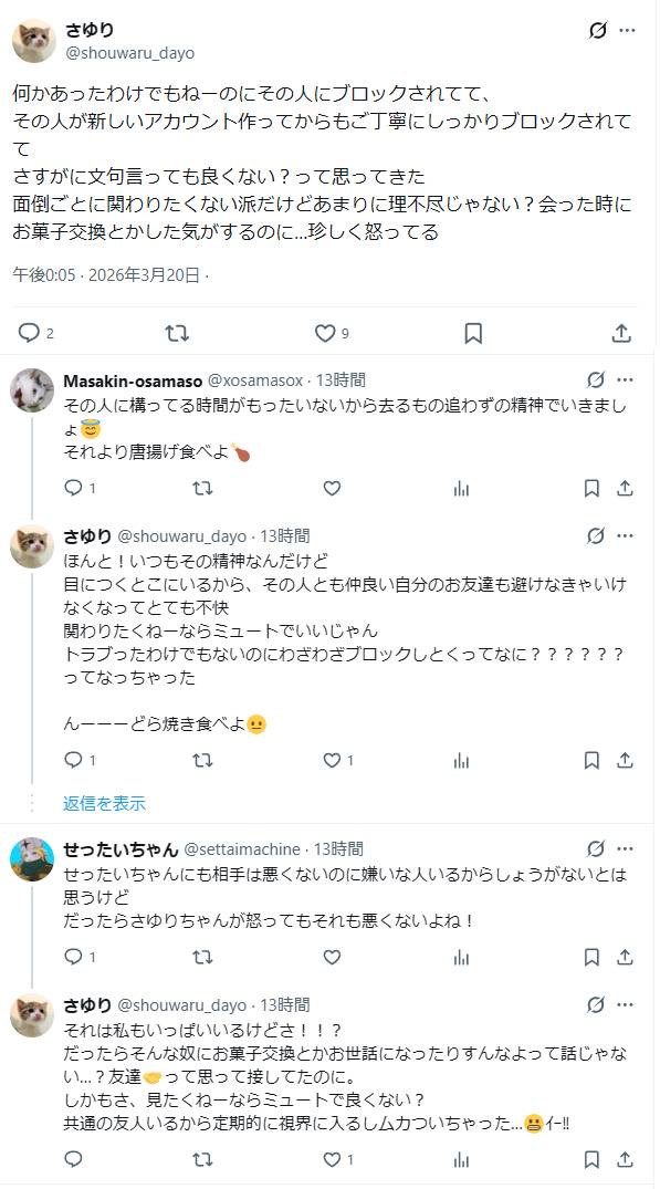 | … | 926/03/21(土)02:00:40No.1412696504そうだねx7>ミュートなら良くてブロックはイー!ってなるのがよくわからない |