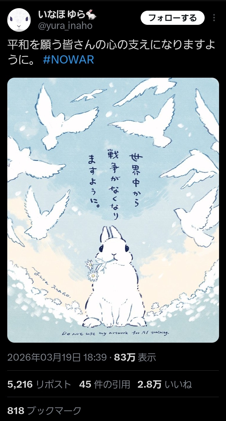 | … | 2626/03/21(土)10:12:16No.1412739629そうだねx4>平和が地雷ワードになるっていうのも嫌なご時世だな |
