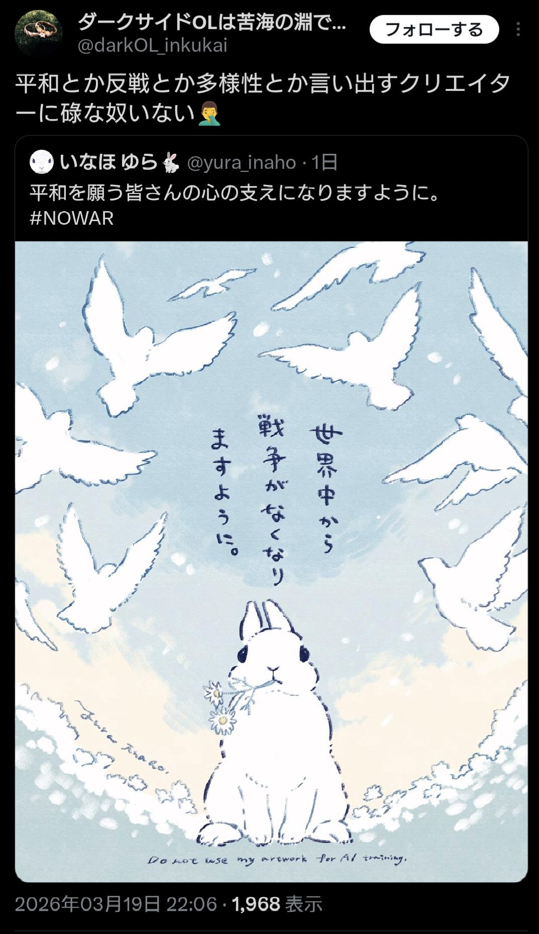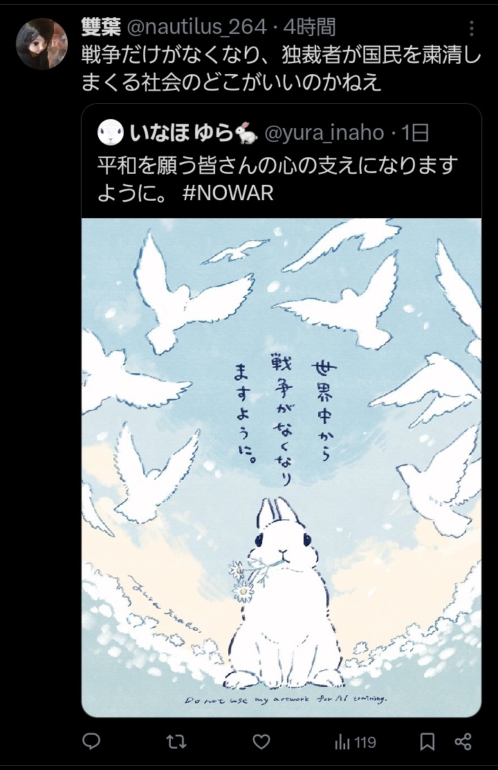 | … | 12026/03/21(土)11:02:02No.1412749583+>胡散臭い連中が平和や反戦をお題目に暴れるのが悪いんだよなァ… |