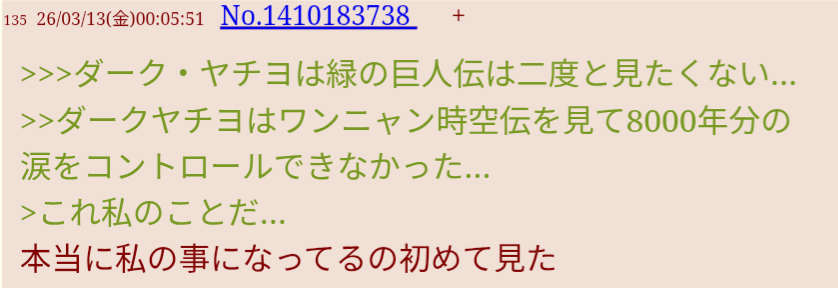 | … | 13526/03/21(土)13:08:12No.1412782141+こっちで鉄人兵団やってる時にめぶきの方ではワンニャンやってたから自認ヤチヨ実況したい人は多いんだな |