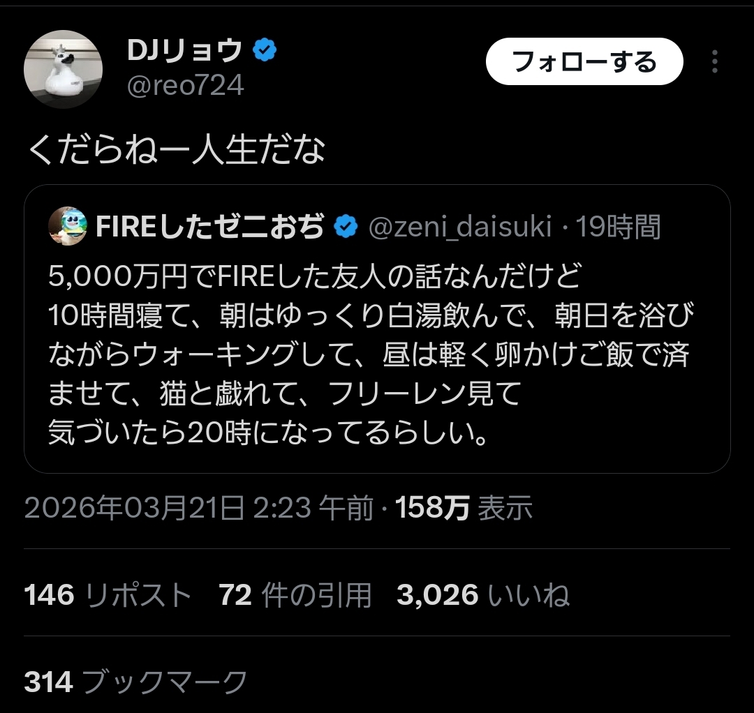 | … | 2826/03/21(土)15:27:02No.1412820512そうだねx14言っとくけどXでFIREって言ってるやつ99%嘘アカだぞ |