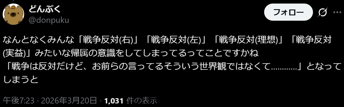 | … | 6026/03/21(土)16:34:40No.1412838387そうだねx15戦争反対を今叫んでるのは自分の同町しない奴は戦争推進派だってレッテル貼ってるから嫌いってだけ |