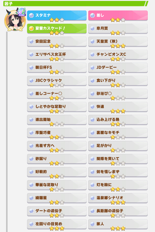 | … | 4226/03/21(土)18:43:46No.1412876847+キセキちゃん勝たせたくて逃げ育成頑張ってるけどサポカから有効になりそうなスキルが全然取れなくて辛えのだ… |