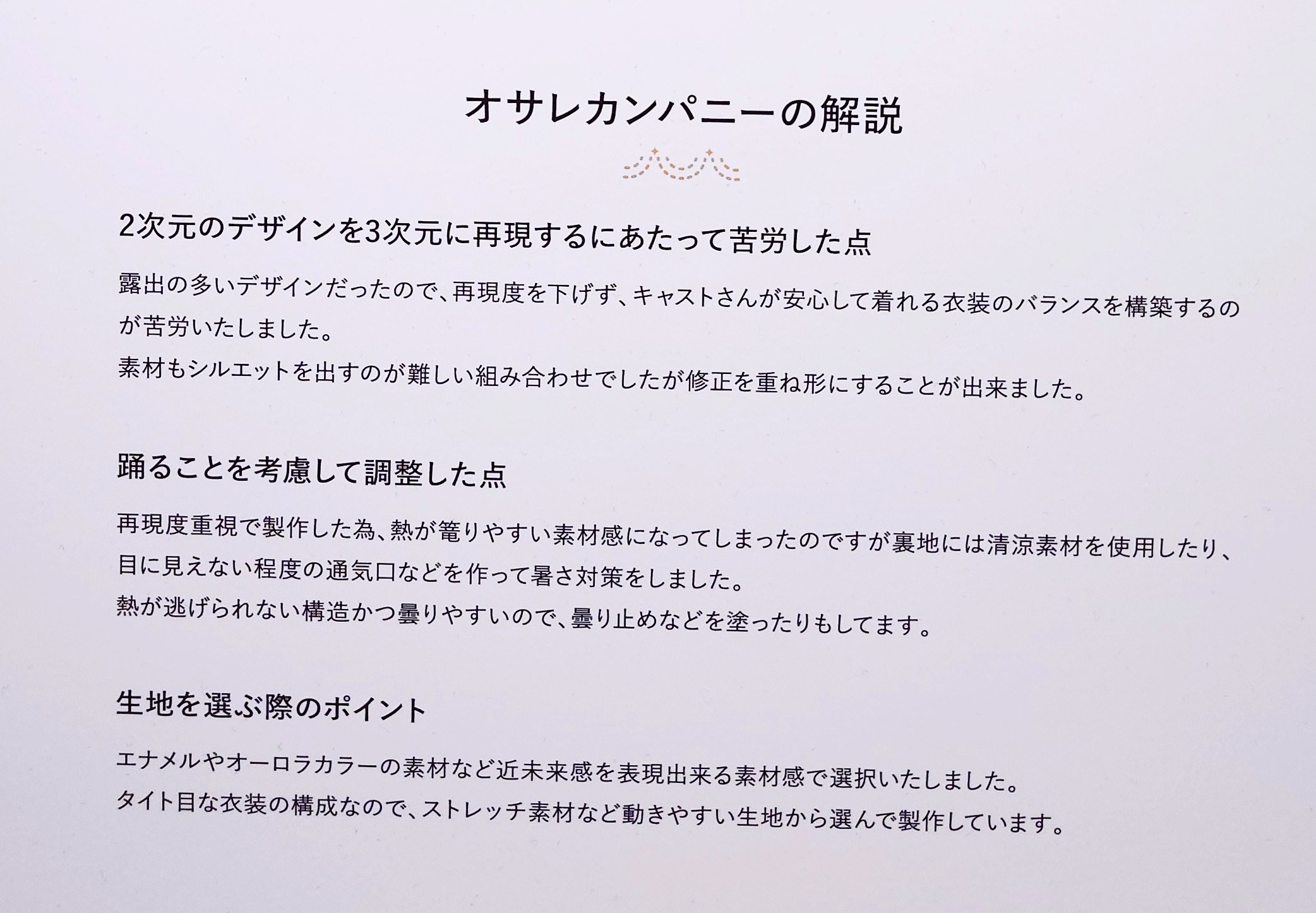 | … | 1526/03/21(土)21:00:25No.1412932132+オサレカンパニーの解説読んでるとやっぱり衣装の露出か熱籠るのに触れてるの多くて大変なんだなと |