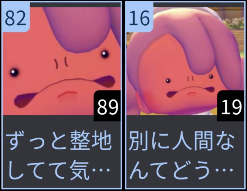 | … | 4526/03/22(日)00:15:43No.1413008664そうだねx1ポケモンによって割とニンゲンへの関心度合いに差があるよね |