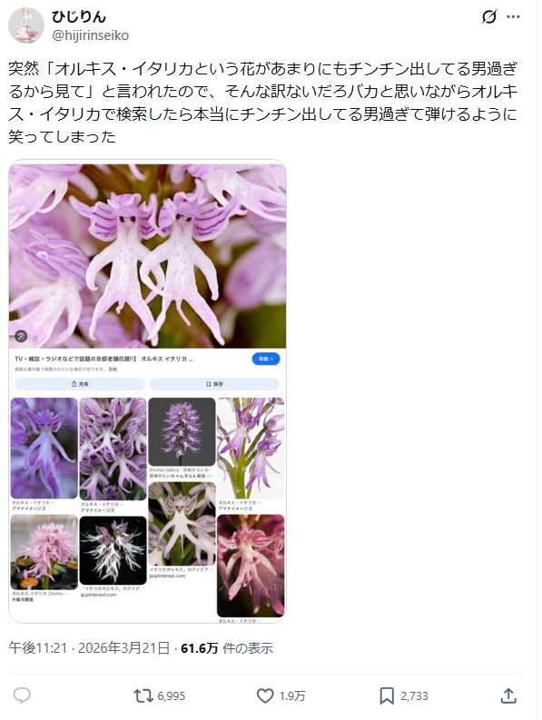 | … | 926/03/22(日)09:46:00No.1413082878+英語では Naked Man Orchid(「裸の男の蘭」の意)とも通称される(wiki)マジだった |