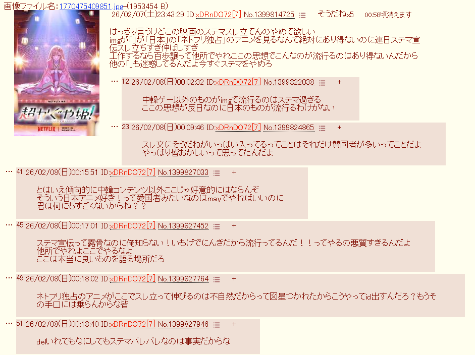 | … | 8626/03/22(日)12:17:48No.1413120372そうだねx3超かぐや姫観るのにはネトフリに金払うか映画館に金払うかしないといけないから荒らしには無理だよね… |
