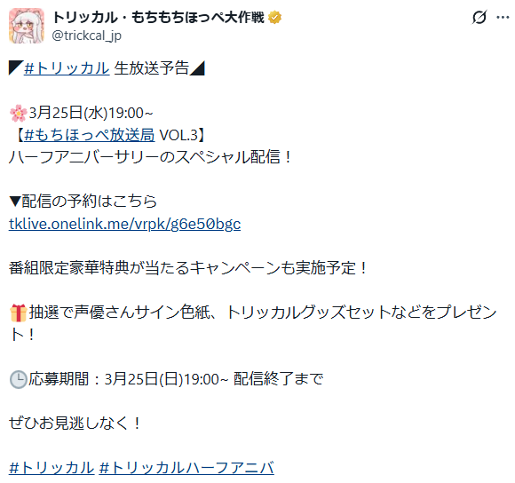 | … | 3026/03/22(日)14:17:17 ID:o3BTKK1QNo.1413155243+トリッカルグッズを受け取ってついでにクレープフェスタも楽しめるにゃんね |