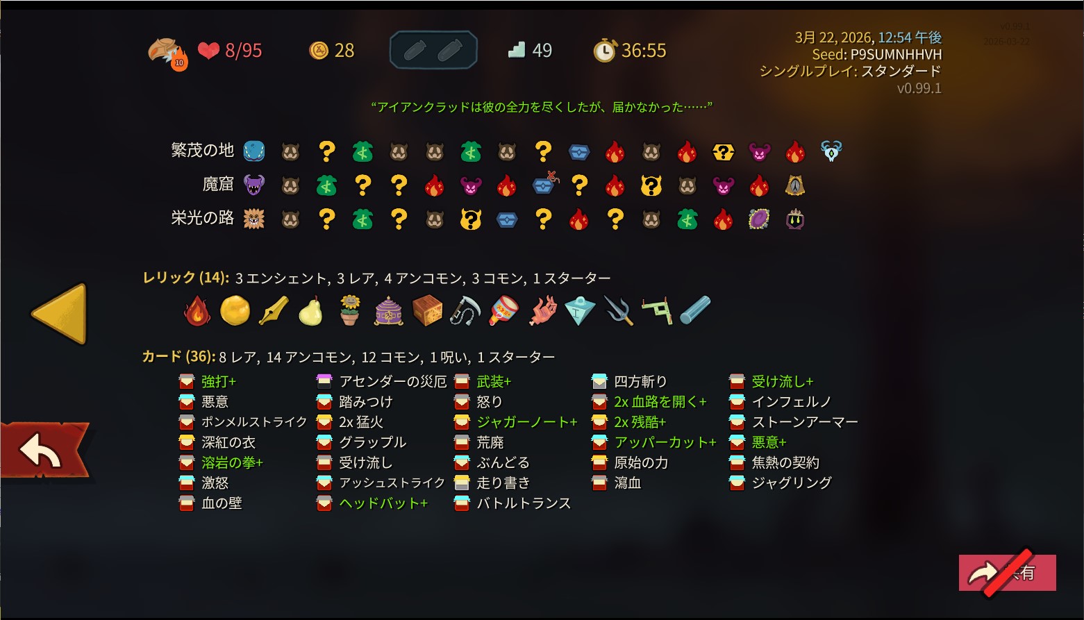 | … | 27226/03/22(日)15:13:15No.1413170054+破滅を自身に付与する系のカードは破滅の数値を増やしたら一気に使いづらくなりそうではある |