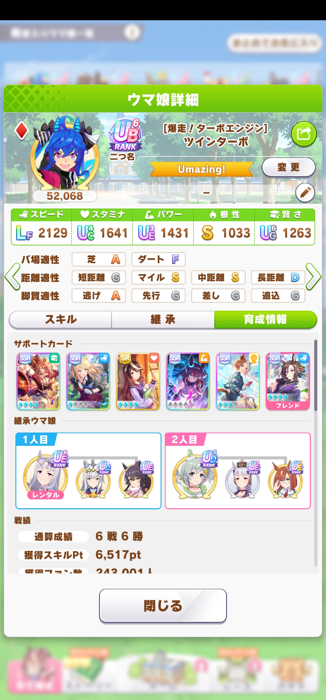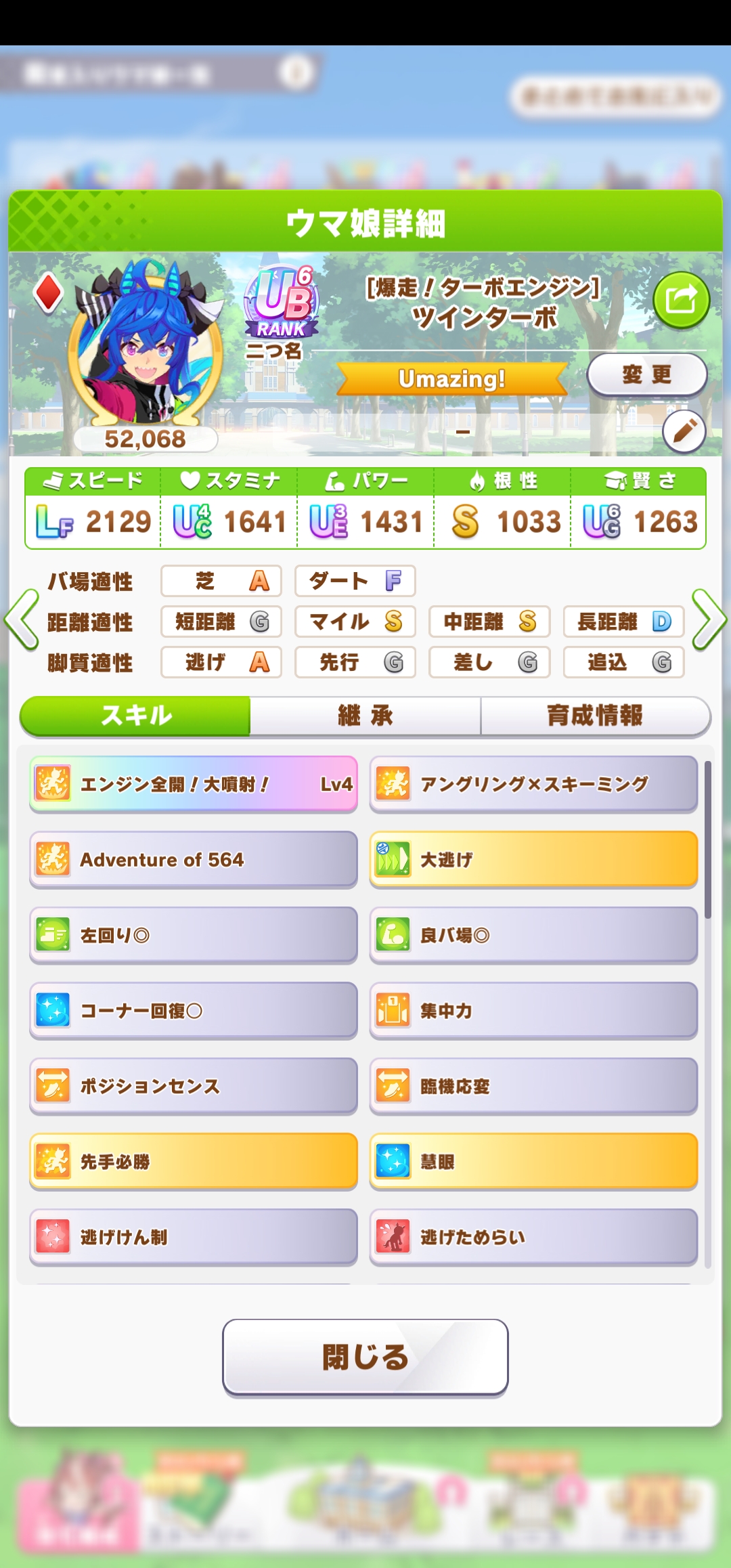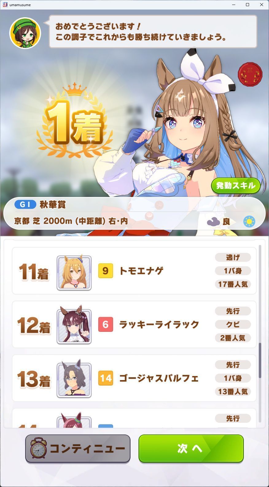 | … | 18626/03/22(日)16:51:17 ID:V7.A0MJwNo.1413199413+まあ今回の大逃げ牽引はデバフより終盤前まで引っ張るのがメインなのでデバフはそこまで必要ないかもしれません スタート時に先頭取れるようなスキル取りにしましょう |