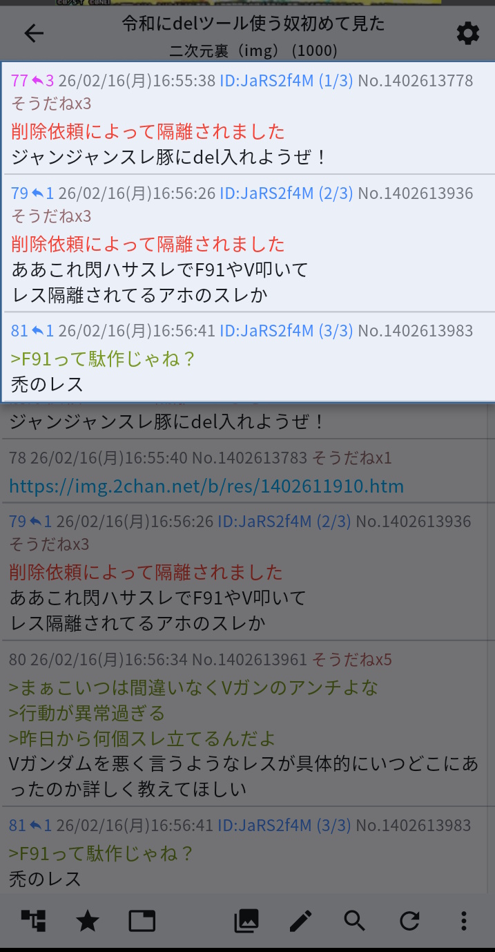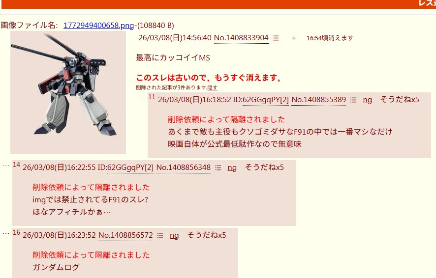 | … | 14826/03/22(日)17:05:18No.1413203804+>>今荒らしてるの多分ガンダム全然知らないやつだな |