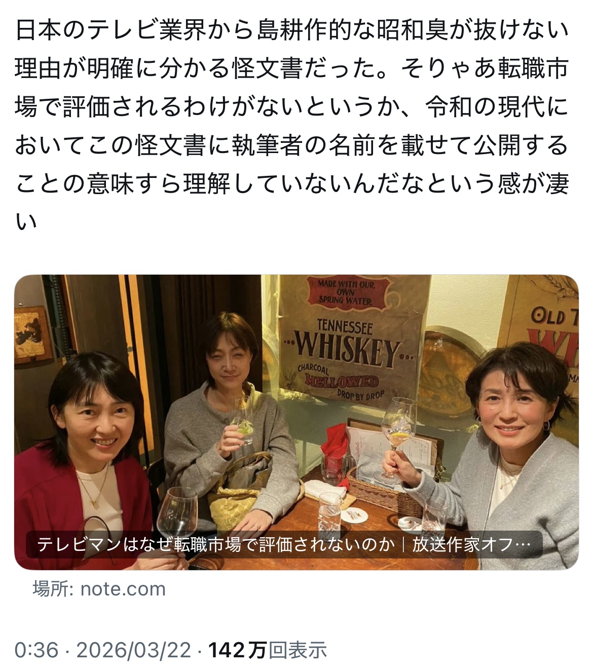 | … | 7026/03/22(日)16:11:07No.1413187309そうだねx14というよりもこの文章の痛々しさをテレビ屋という曲がりなりにも人に伝える職種の人がやってるのがなお痛々しい |