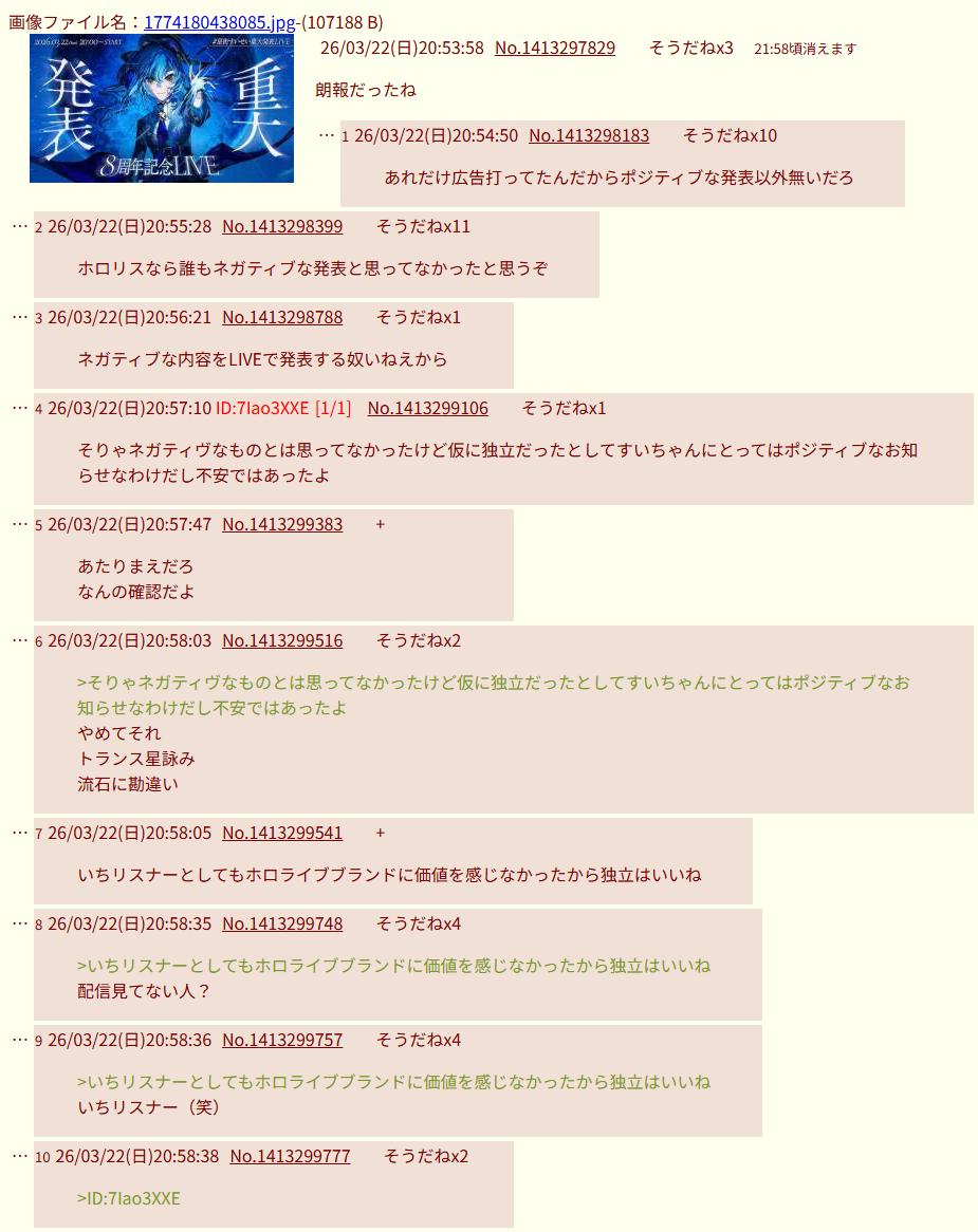 | … | 4026/03/22(日)21:04:00No.1413302325そうだねx15>個人事務所作るって事はホロライブのマネジメント体制に不満があったってこと? |